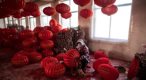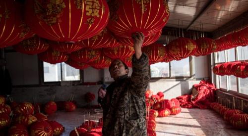 Một công nhân đang treo đèn lồng lên cao để chúng khô trong nhà máy ở làng Tuntou. Ngoài một số nhà máy lớn, đa phần đèn lồng ở đây được sản xuất từ những xưởng sản xuất quy mô nhỏ thủ công dưới dạng tập trung theo hộ gia đình.
