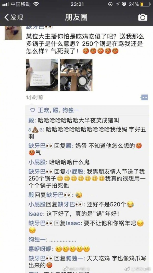 Tuy vậy, cô gái lại cảm thấy khá bức xúc trước món quà mà “fan hâm mộ” gửi tặng”. Cô chia sẻ trên trang cá nhân: “Anh ta muốn tôi ăn gà đến ngu ngốc ư? Tặng cho tôi nhiều chảo như thế này là có ý gì? Tận 250 chiếc chảo có phải muốn mắng tôi hay như thế nào? Thật là tức chết đi được. Tôi muốn dùng từng cái một 'xử' hắn”.