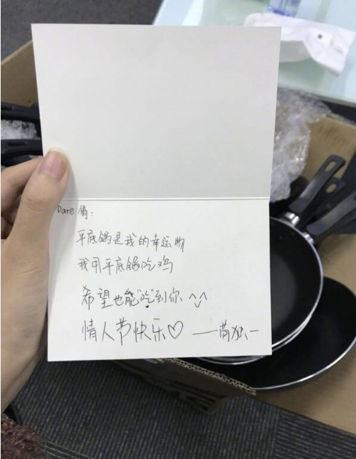 Nhân ngày lễ tình nhân, anh chàng gửi tặng quà là 250 chiếc chảo để biểu lộ tâm ý, kèm theo đó là một tấm thiệp có nội dung: “Đối với anh, chiếc chảo là một vật khá may mắn. Nó khiến anh được ăn gà mỗi ngày. Anh hy vọng món quà này có thể khiến anh có được tình cảm của em. Chúc em có một lễ tình nhân vui vẻ”.