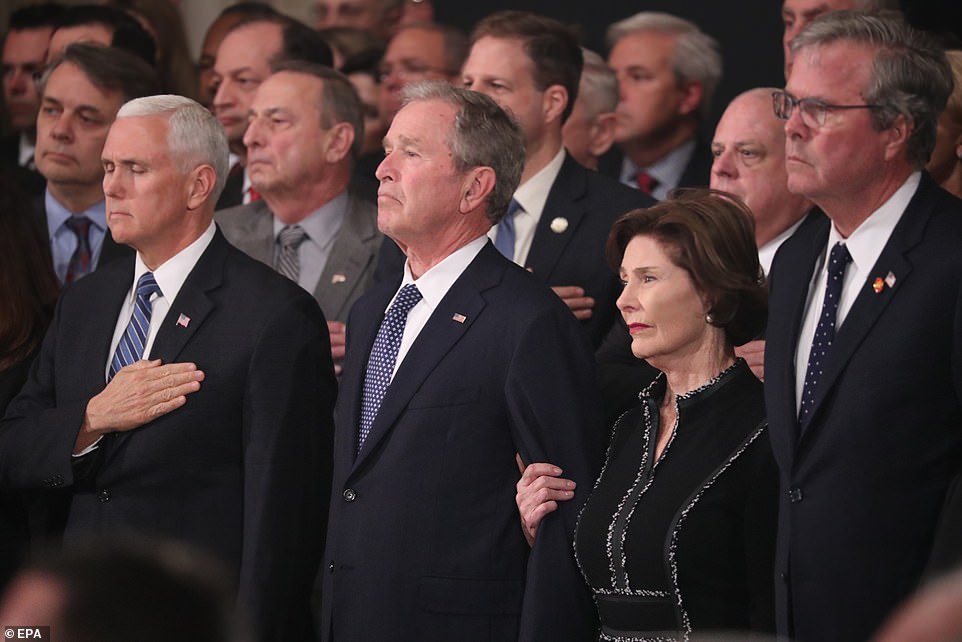 Phó Tổng thống Pence, cựu Tổng thống George W. Bush, cựu đệ nhất phu nhân Laura Bush, và cựu Thống đốc bang Florida, Jeb Bush tham dự lễ viếng.
