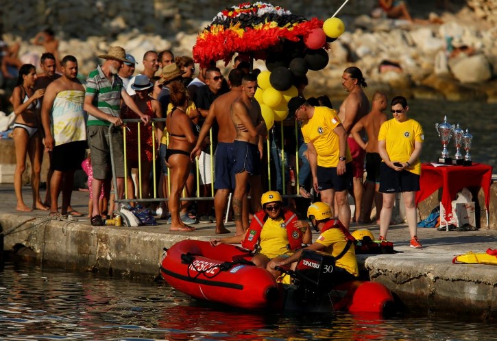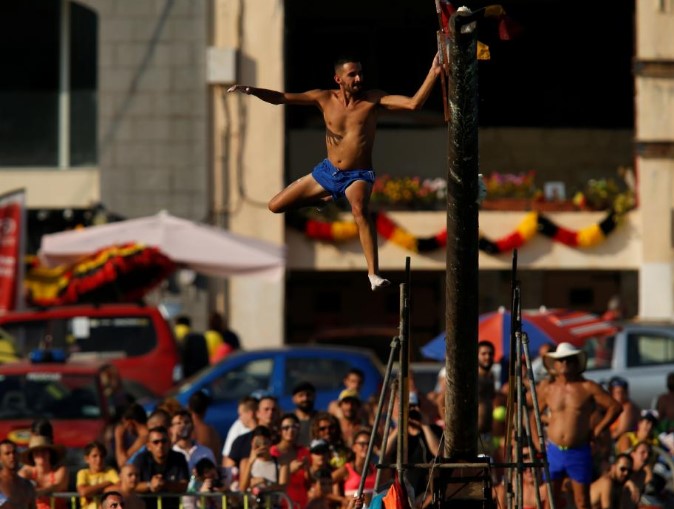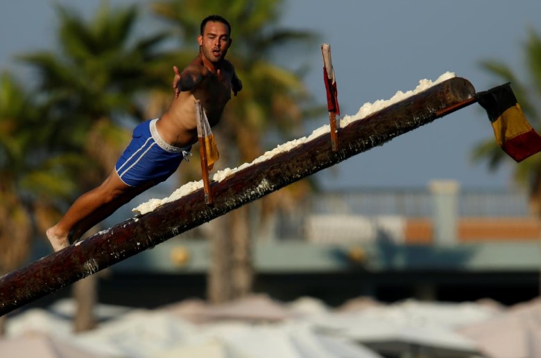Một người chơi cố lấy lá cờ khi ông ngã khỏi “gostra”, tên một thanh gỗ phủ đầy mỡ lợn, trong cuộc thi tại lễ hội tôn giáo của thị trấn St Julian, Malta 27/8/2017.
