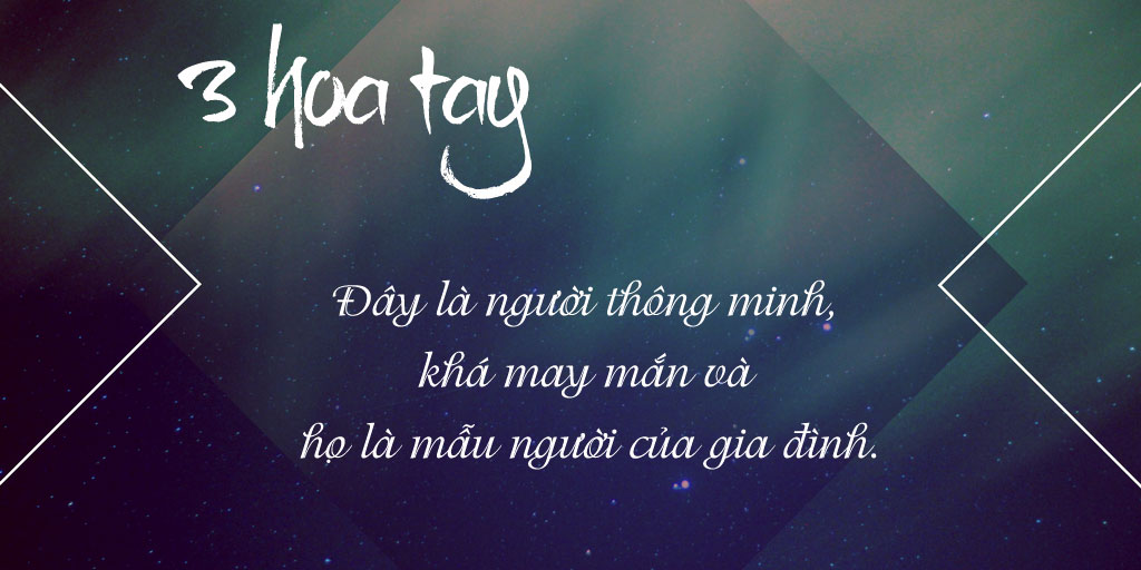 Sở hữu 3 hoa tay nằm trên cùng một tay, bạn là người thông minh, chăm chỉ và có tài lãnh đạo. Không những thế, bạn còn hết lòng giúp đỡ những người khác nên được nhiều người yêu quý. Bạn là mẫu người của gia đình. Nếu là đàn ông, bạn chắc chắn chắc là một người chồng tốt, một người cha mẫu mực. Nếu là phụ nữ, bạn luôn biết cách chu toàn “việc nước việc nhà”.