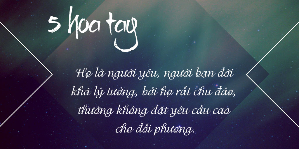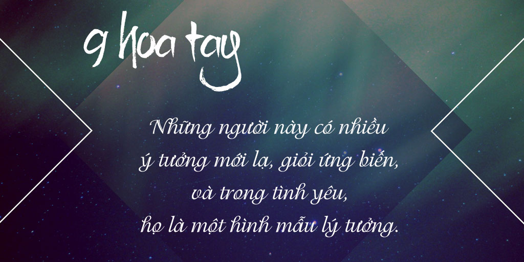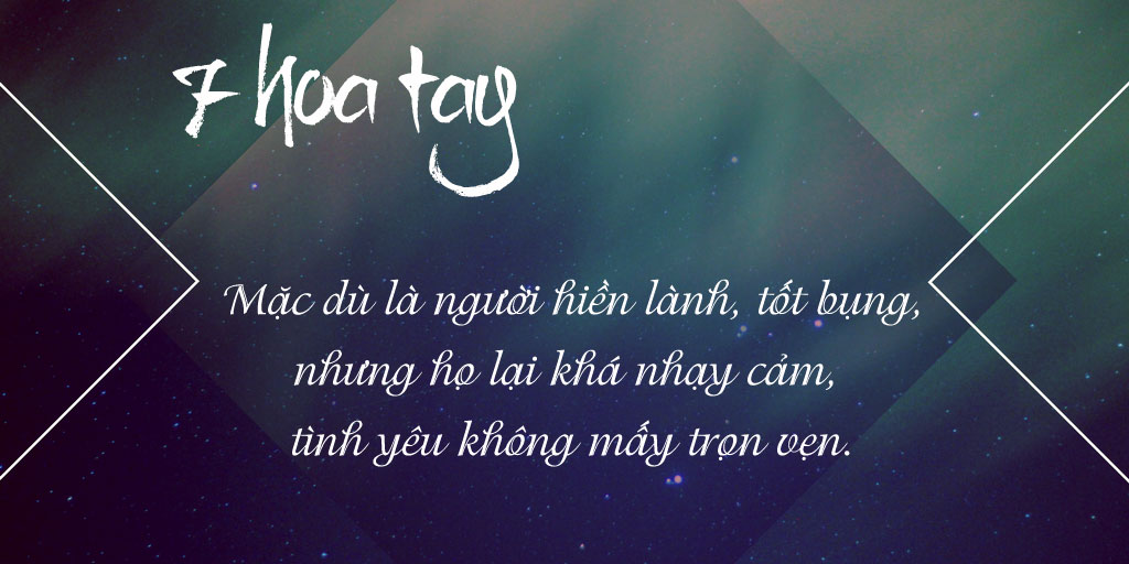Người này rất tốt bụng, lương thiện nhưng có tính cách khá mâu thuẫn. Bên trong nội tâm của họ rất yếu đuối, mềm mỏng nhưng luôn tỏ vẻ mạnh mẽ, kiên cường. Đa số những người có 10 hoa tay thường làm việc trong lĩnh vực nghệ thuật. Khi yêu ai, những người này sẽ yêu hết mình, là một kẻ si tình.
