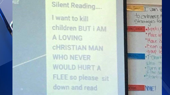 Trường trung học Otho E. Stuar ở thành phố Commerce, bang Colorado, Mỹ, sa thải giáo viên dạy lớp 8 Kris Burghart. Nguyên nhân là do vị giáo viên này chiếu lên bảng dòng chữ đầy bạo lực và đe dọa, khiến nhiều học sinh sợ hãi.