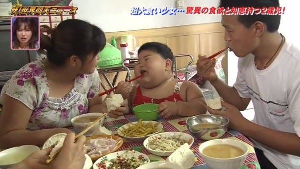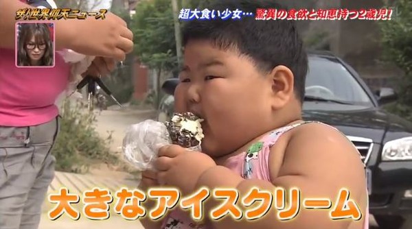 9 năm trước, một chương trình tạp kỹ của Nhật Bản đã đến Trung Quốc đại lục đưa tin về một cô bé mới 2 tuổi đã nặng 43kg. Việc đầu tiên mà cô bé họ Vương làm mỗi khi thức dậy đó là thưởng thức một bàn bữa sáng thịnh soạn, chỉ trong chốc lát cô bé có thể ăn hết 10 phần bánh bao nhân thịt, cơm, thức ăn và canh, sau đó là dưa hấu và một vài loại hoa quả khác. Sau 1 tiếng, cô bé lại trèo lên xe máy cùng mẹ đến cửa hàng tạp hóa ăn kem.