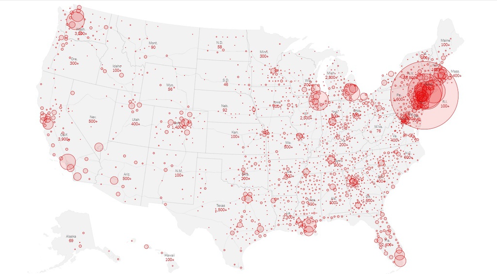 Mật độ ca nhiễm COVID-19 trên khắp nước Mỹ cho thấy các bang phía đông bắc, trong đó trung tâm là New York, là nơi chịu ảnh hưởng nghiêm trọng nhất của dịch bệnh. Đồ họa New York Times