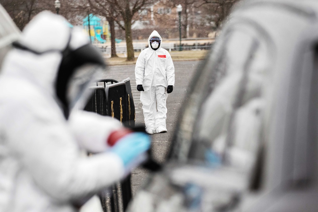 Nhân viên y tế bang Connecticut đang quét vòm họng để lấy mẫu bệnh phẩm tại một trạm xét nghiệm lưu động.
