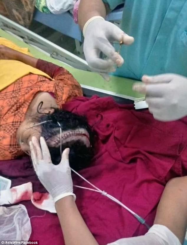 Cô bé bị khâu nhiều mũi trên đầu. Tuy thoát chết nhưng vùng đầu bị tổn thương nghiêm trọng.