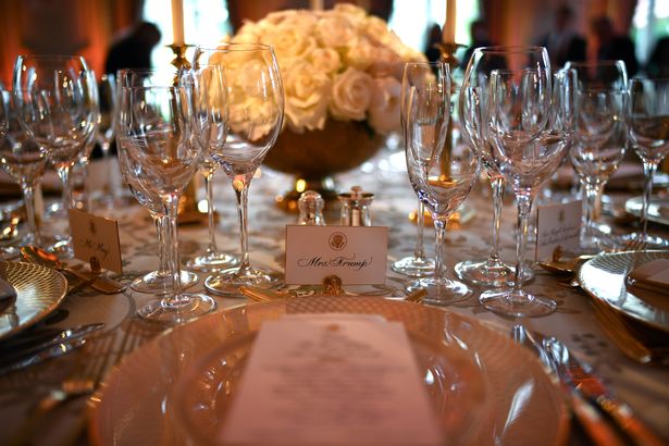 Những chiếc bàn ăn được phủ khăn trải bàn có hoa văn và hình con chim, đặt trên đó là những chiếc đĩa trang trí bằng vàng và dao dĩa cũng bằng vàng. Chân nến trang trí cũng được gia chủ chọn màu vàng làm chủ đạo, đặt cạnh bình hoa hồng và tất nhiên, 6 bàn tiệc mỗi bàn 10 chỗ ngồi cũng được bao quanh bởi những chiếc ghế màu vàng đi kèm.