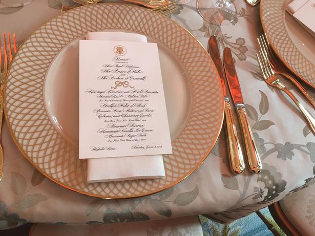 Những vị khách quý được vợ chồng Tổng thống chiêu đãi món pho mát burrata tươi với cà chua, húng quế và muối Maldon, sau đó là phi lê thịt bò nướng, rau cải xoong, cần tây củ cải và cà rốt Chantenay. Đối với bánh pudding tráng miệng, họ dùng với các loại quả mọng mùa hè, kem vani homemade và bánh wafer nướng với đường Muscovado.