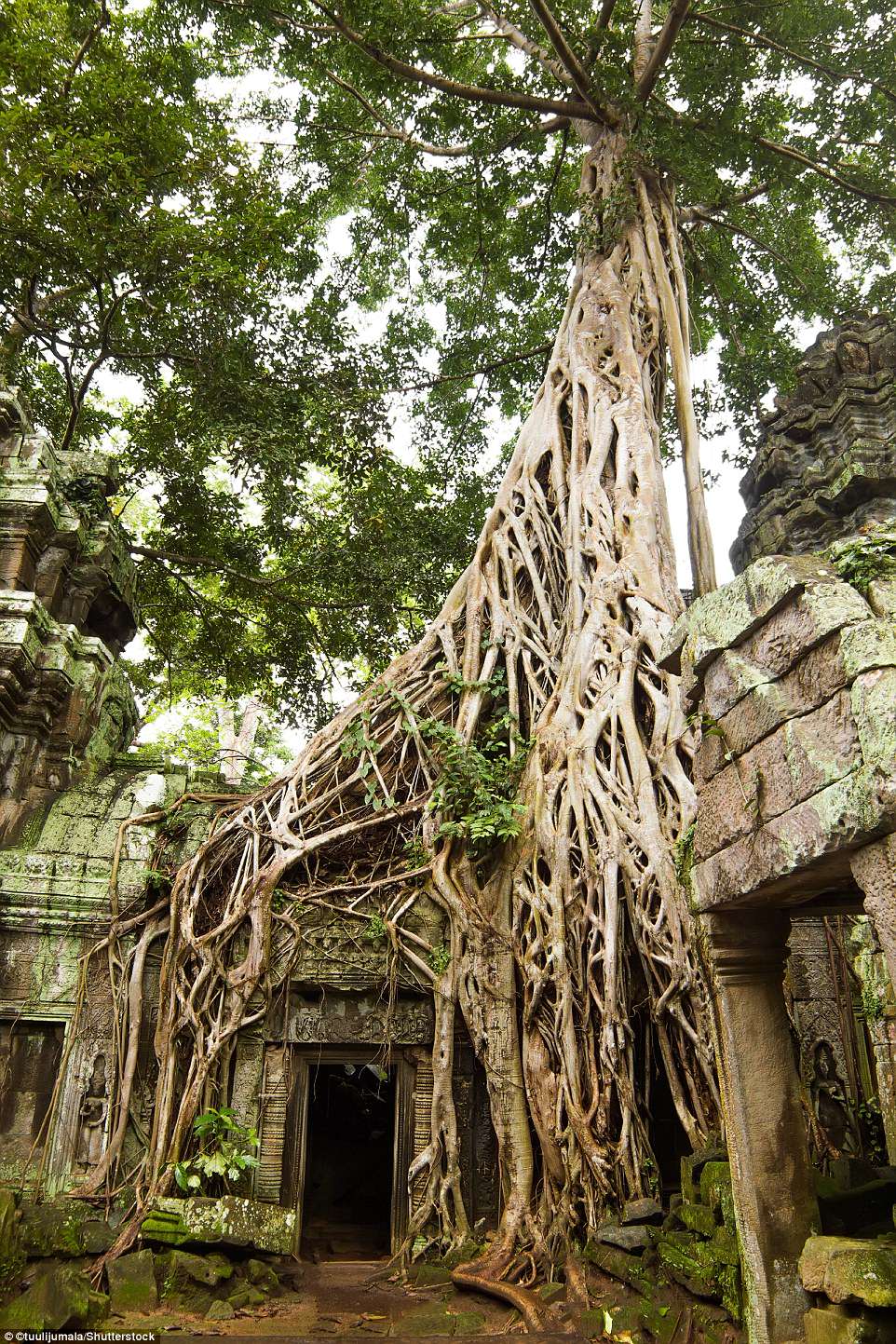 Đền Taprom còn được gọi là Lăng mộ Hoàng hậu, nơi những cây cổ thụ vĩ đại bao phủ nhiều công trình, tạo nên những hình thù cổ quái và hấp dẫn. Một trong những lối vào ngôi đền Angkor Wat nổi tiếng nằm ở Siem Reap, Campuchia với chiều dài hơn 800 m và được bao quanh bởi một hào nước rộng lớn. Ảnh: Shutterstock
