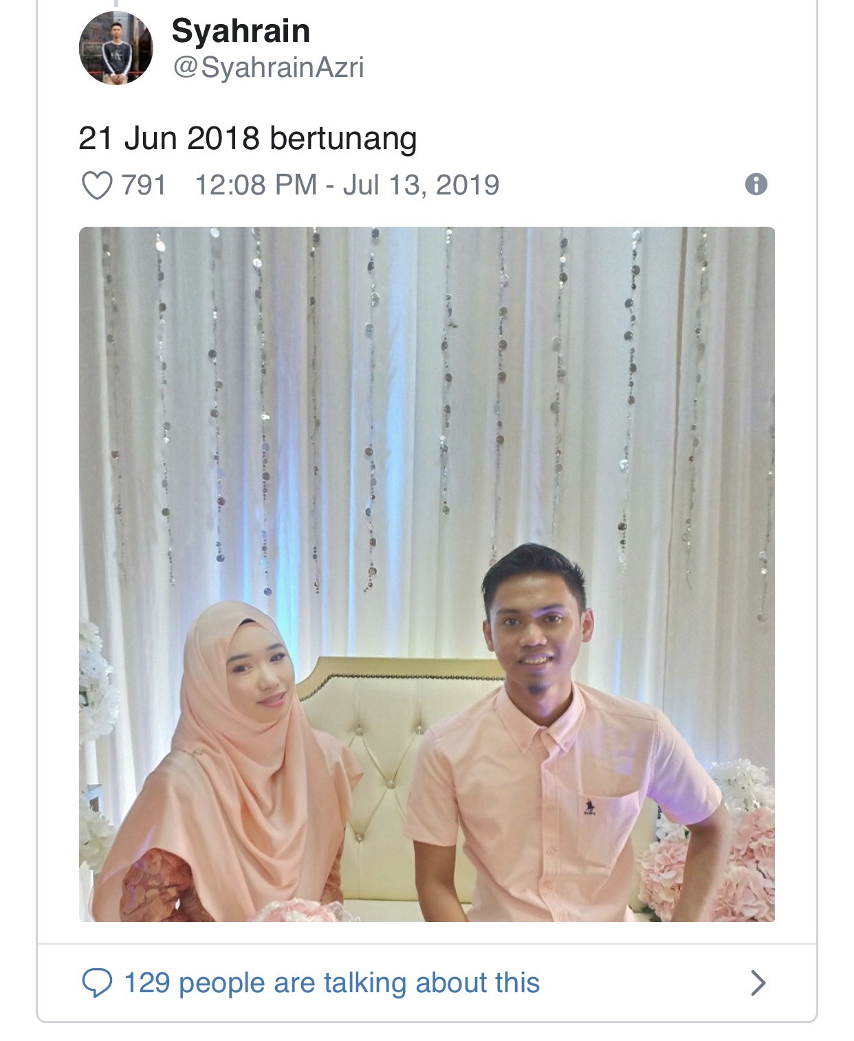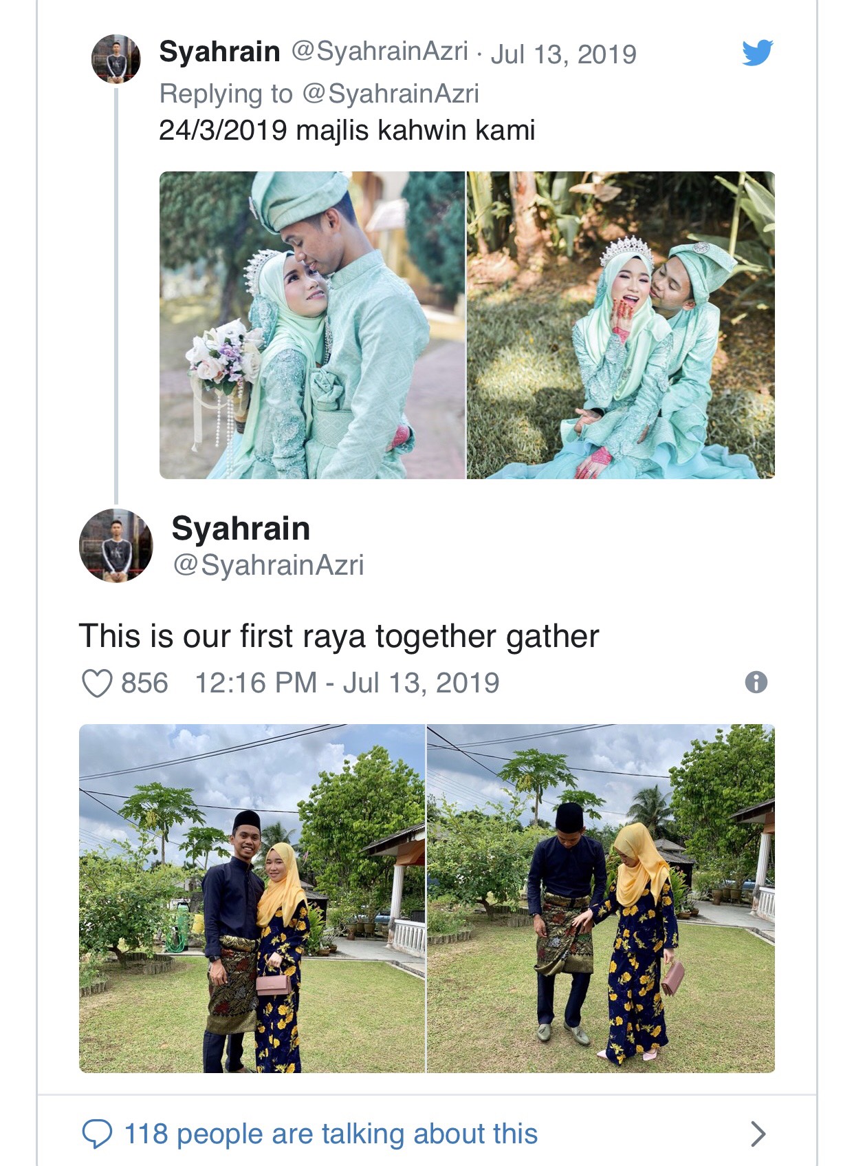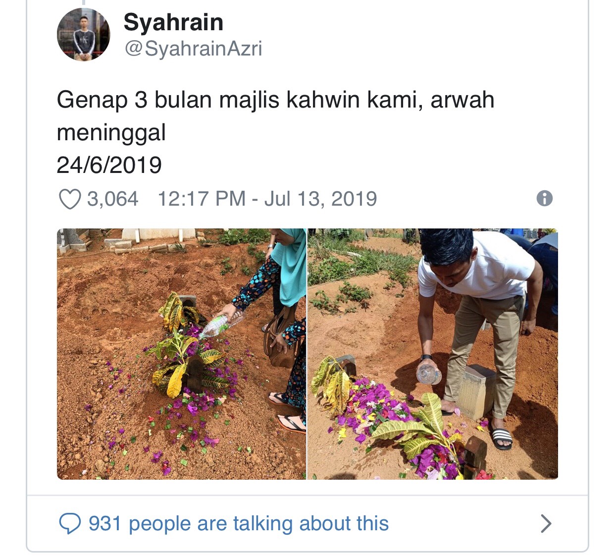 Trong một bài đăng trên Twitter, Syahrain (@SyahrainAzri) đã chia sẻ những hình ảnh và kỷ niệm về người vợ yêu dấu của mình, từ lần đầu gặp gỡ tại trường trung học, cho đến lễ đính hôn, lễ cưới, lễ Raya đầu tiên bên nhau cho đến cả tang lễ.