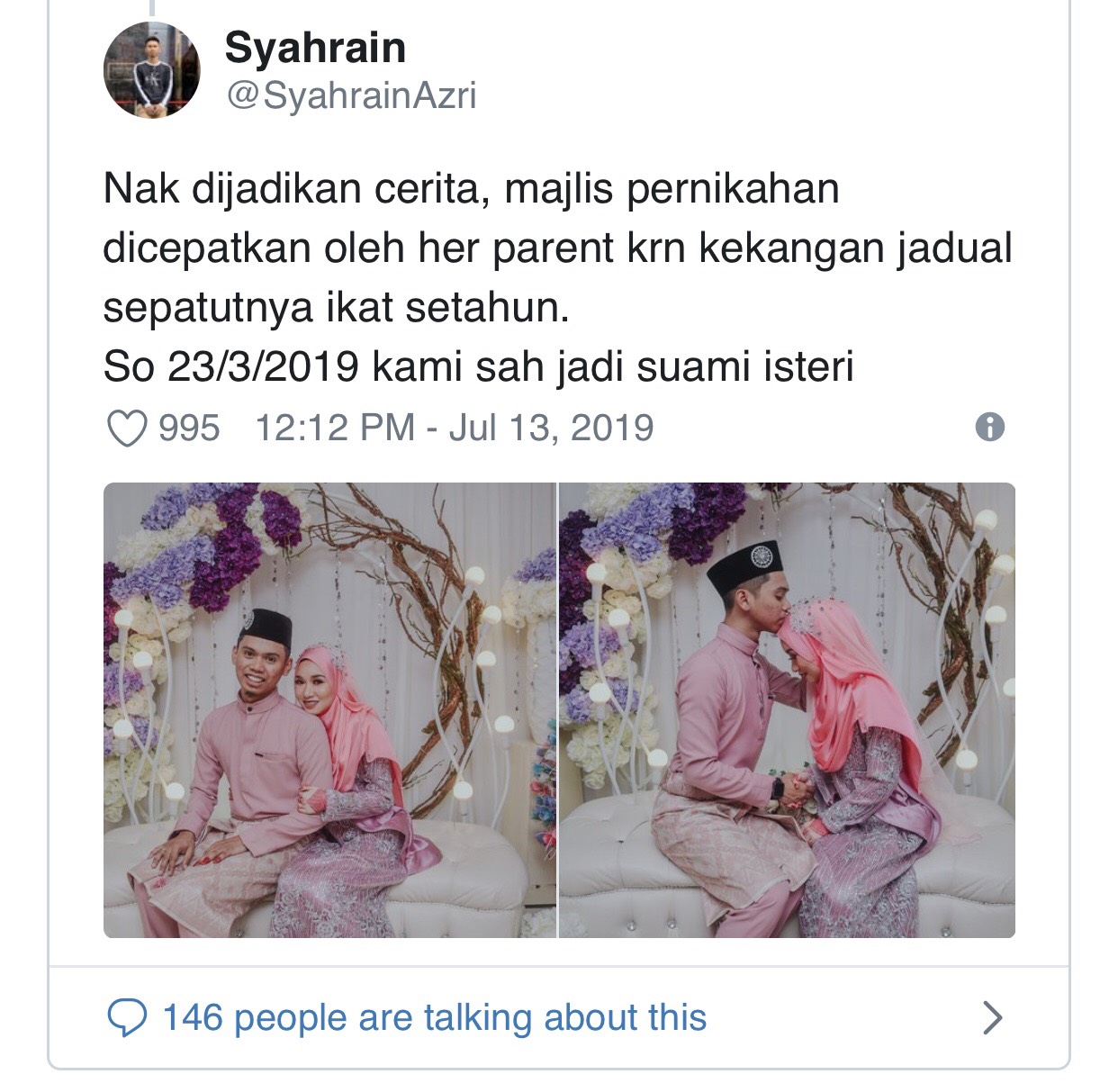 Syahrain nói thêm: “Thánh Allad đã giúp chúng tôi, đáng lẽ chúng tôi vào tháng 6, sau lễ Raya, nhưng Ngài đã trao cho chúng tôi cơ hội kết hôn sớm hơn và chung sống với nhau dù chỉ trong thời gian ngắn ngủi”.
