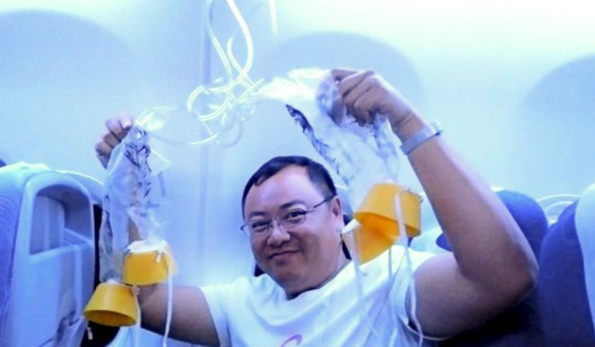 Hành khách chụp ảnh với mặt nạ oxy khi sự cố xảy ra. Ảnh: SCMP
