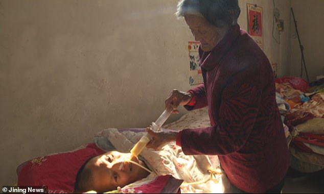 Người mẹ già ngày đêm chăm sóc con trai hôn mê suốt 12 năm. Ảnh: Jining news