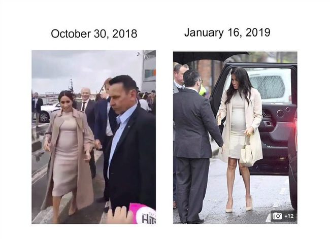 Trong một loạt những bức ảnh được chia sẻ trên mạng Twitter, có thể thấy chiếc bụng bầu của Meghan lúc to, lúc nhỏ, lúc nhô cao, lúc xuống thấp.