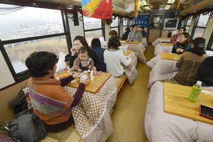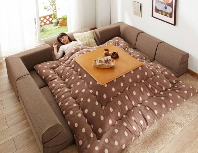 Chiếc bàn kiêm luôn giường ngủ này được gọi là Kotatsu, gồm một lớp chăn dày đặt giữa mặt bàn và khung đỡ, cùng với một nguồn sưởi bằng nhiệt đặt ngay dưới chăn. Với thiết kế này, bạn tha hồ nằm duỗi thẳng chân trong lớp chăn ấm áp. Một điều thú vị nữa là nếu mặc quần áo truyền thống kiểu Nhật, hơi nóng sẽ đi qua từ phía dưới sợi dây cột áo chạy đến vị trí cổ, sưởi ấm toàn bộ cơ thể.