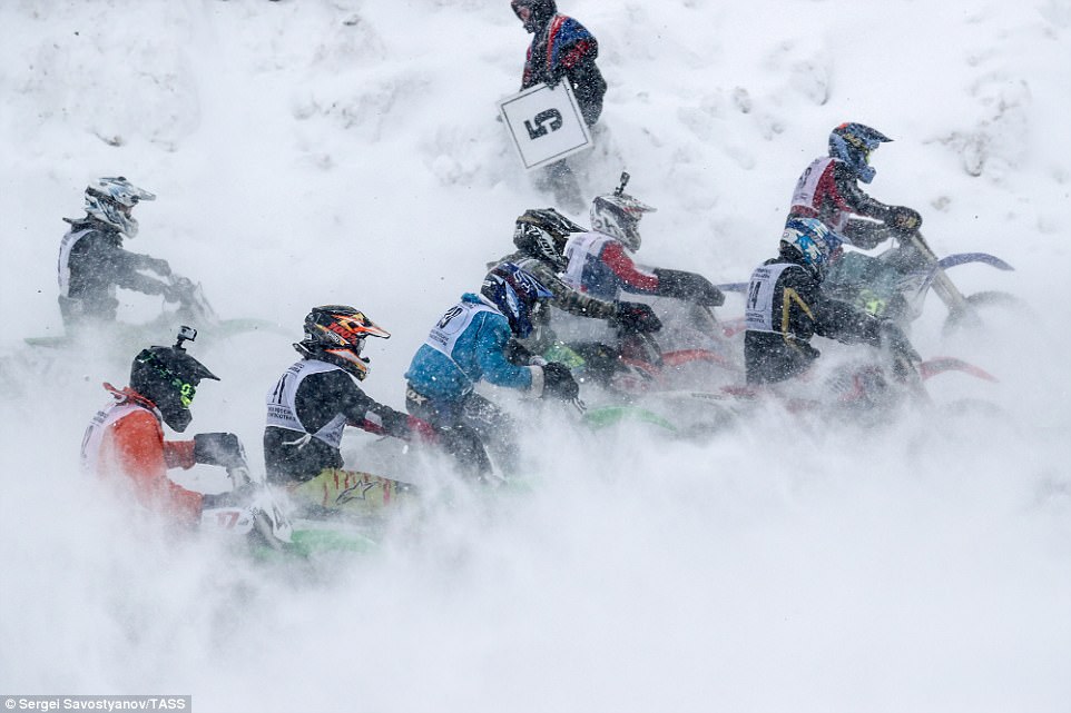 Giải đua mô tô Valery Chkalov Cup diễn ra ở thành phố Mytishchi gần Moscow trong điều kiện tuyết rơi kín lối. Ảnh: TASS