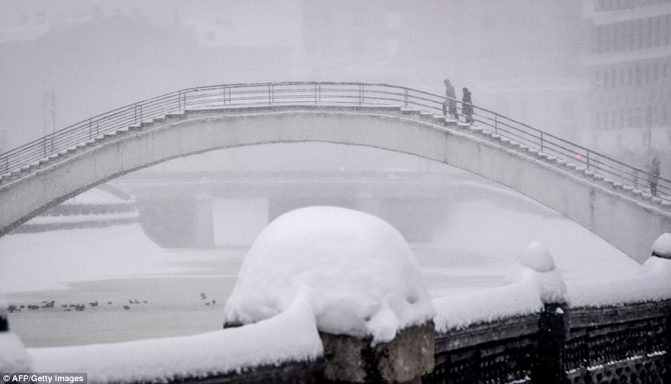 Nhiệt độ ở khu vực trung tâm gần xuống tới mức 0 độ C. Các nhà khí tượng mô tả thời tiết như hiện nay ở Moscow là do chịu ảnh hưởng từ “cuộc xâm chiếm của Bắc cực”. Dù không lạnh như ở Bắc cực nhưng hầu như người dân không thể di chuyển qua các con đường ngập tuyết. Ảnh: AP