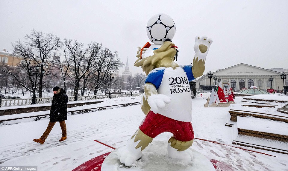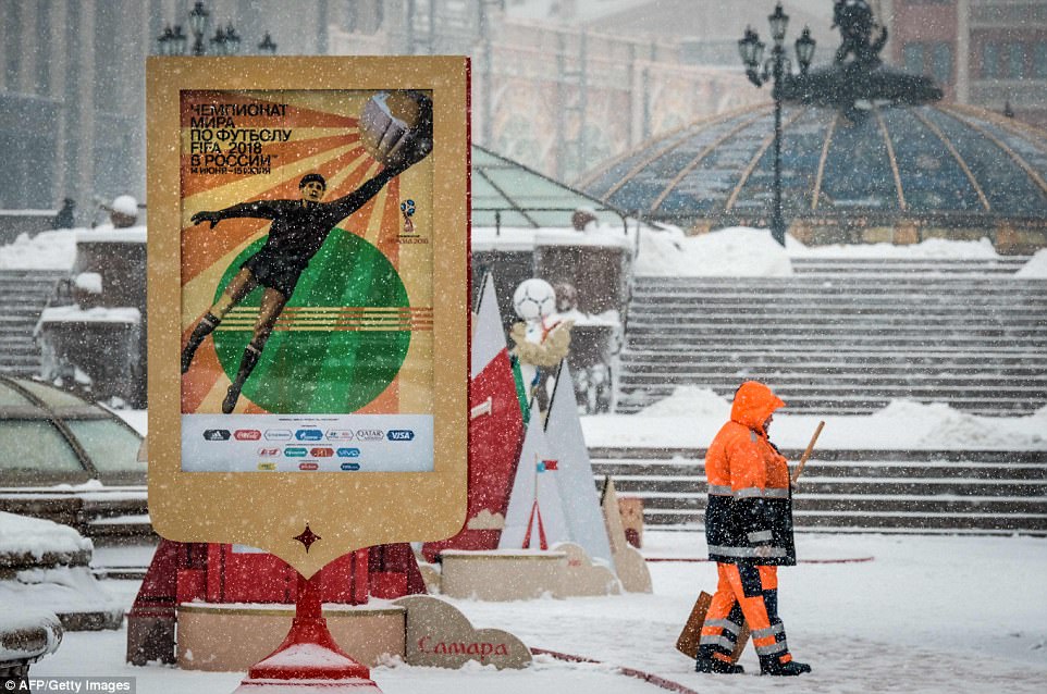 Một công nhân đường phố di chuyển qua tấm áp phích quảng bá sự kiện FIFA World Cup tại Quảng trường Manezhnaya phủ đầy tuyết. Ảnh: AFP/Getty
