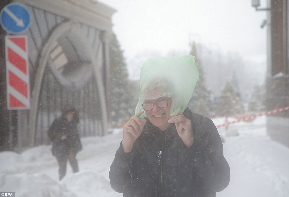 Một người đàn ông dùng túi ni lông che đầu khi tuyết rơi ngập lối. Các nhà khí tượng dự báo bão tuyết sẽ vẫn tiếp tục diễn ra ở Moscow những ngày tới và nhiệt độ có thể xuống mức âm. Ảnh: EPA