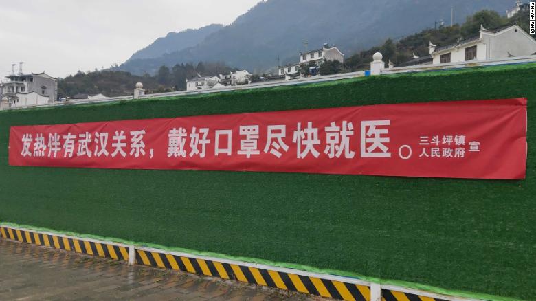 Một biểu ngữ ở thị trấn Sandouping có dòng chữ: “Nếu (bạn) bị sốt và có đi qua Vũ Hán, hãy đeo mặt nạ và gặp bác sĩ.”.