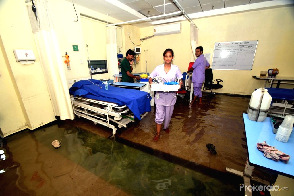 Vào tối 29/7, mực nước tại bệnh viện đã cao tới đầu gối và trong nước có xuất hiện cá và một số loài sinh vật nhỏ.