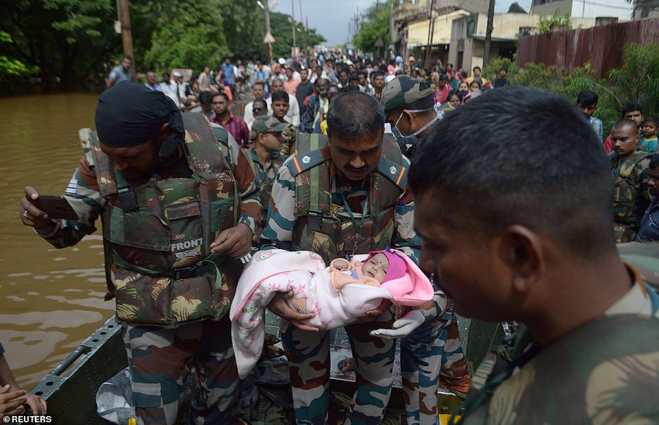 Số người chết vì lũ lụt ở các bang Karnataka, Kerala và Maharashtra của Ấn Độ đã tăng lên 147, trong khi đội cứu hộ chạy đua để sơ tán người dân và những phần di sản thế giới đang ngập trong nước. Trong ảnh, binh sĩ quân đội đưa một đứa bé tới nơi an toàn.