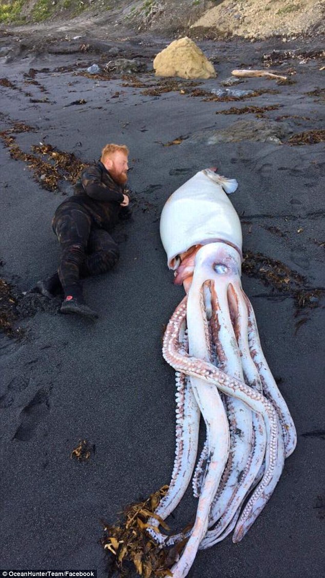 Jack Aplin nằm cạnh con mực khổng lồ. Ảnh: Daily Mail