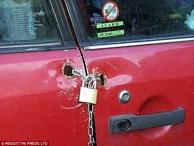 Để đảm bảo tuyệt đối cho “an nguy” của chiếc xe, chủ của nó đã cố định luôn cửa xe bằng một chiếc ốc bản lớn.