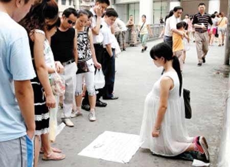 Ngay cả bà bầu cũng sẵn sàng quỳ giữa đường để ăn xin. Ảnh: QQ