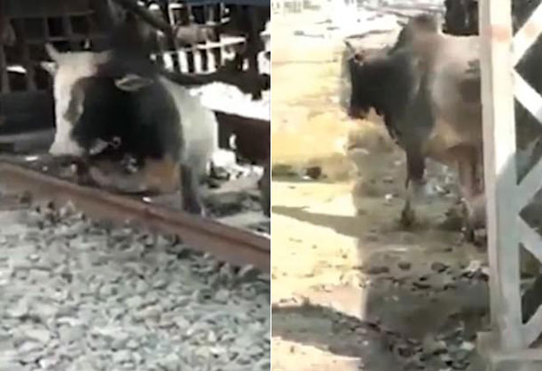 Khoảnh khắc chú bò thoát khỏi đường ray tàu hỏa.
