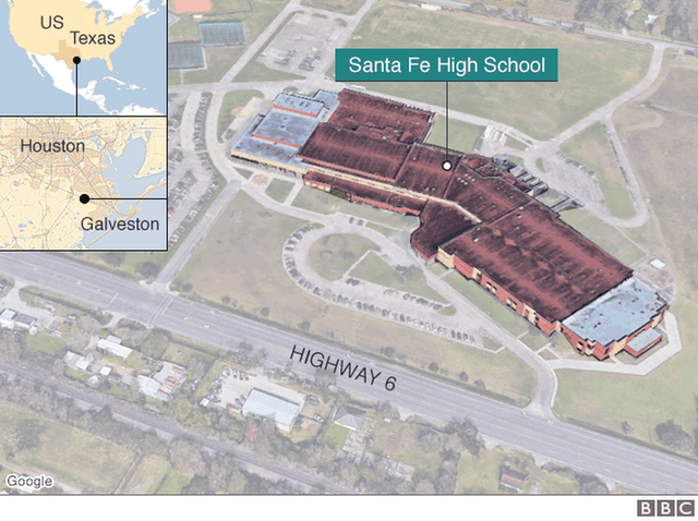 Hiện trường vụ xả súng tại trường Sante Fe, Texas, ngày 18/5/2018. Ảnh: AP