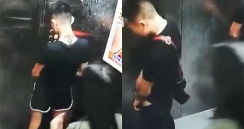 Hai thanh niên thản nhiên đi tiểu trong thang máy.