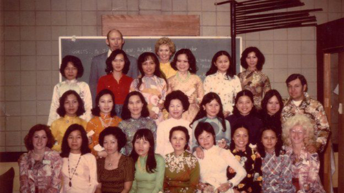 Nữ diễn viên, nhà nhân đạo Tippi Hedren (áo dài vàng, đứng giữa hàng cao nhất) và 20 phụ nữ Việt được cấp chứng nhận thợ làm móng đầu tiên tại Mỹ năm 1975. Ảnh: Hope Village