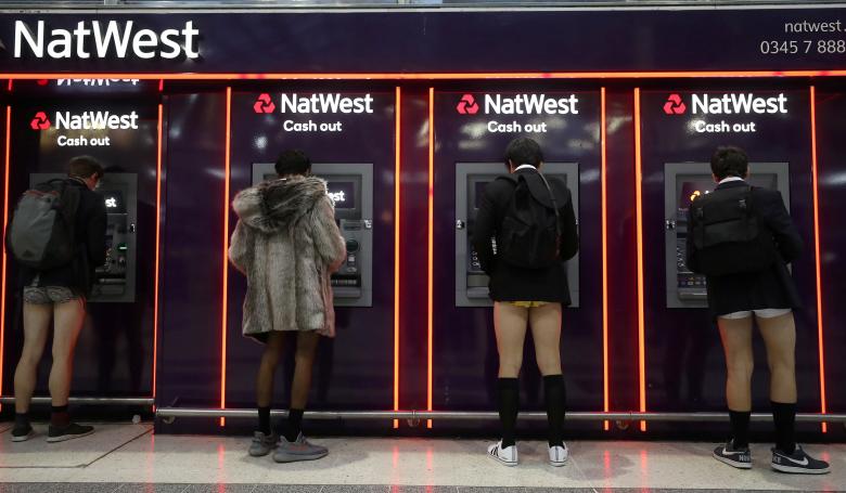 Người dân không mặc quần dài đứng rút tiền tại hệ thống cây ATM tại London, Anh.