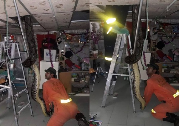 Vào sáng sớm ngày 8/3, một cư dân sống tại quận Bangna, Bangkok, Thái Lan bất ngờ nghe tiếng động lạ trên trần nhà. Sau khi trèo lên để kiểm tra, anh hoảng hốt leo xuống, chạy ra khỏi nhà và gọi ngay cho nhân viên cứu hộ nhờ giúp đỡ vì trên đó là một con trăn khổng lồ.