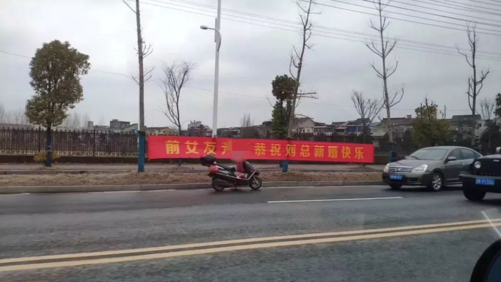 Mới đây, một người đàn ông họ Lưu ở Dương Châu, tỉnh Giang Tô, Trung Quốc, đã được tập thể người yêu cũ tặng một “món quà” vô cùng độc lạ ngay trong ngày cưới của mình. Theo đó, tập thể người yêu cũ gồm 10 cô gái đã căng băng rôn, biểu ngữ, chúc mừng hạnh phúc trên các tuyến đường thuộc thành phố Dương Châu.