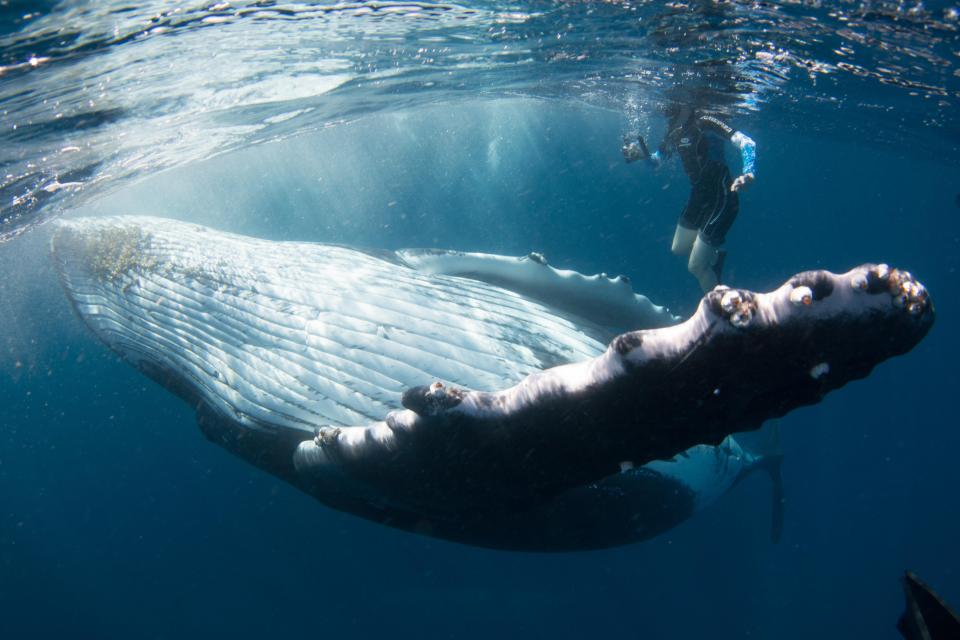 Khoảnh khắc rất thân mật giữa cá voi lưng gù với nam thanh niên. Ảnh: The Sun