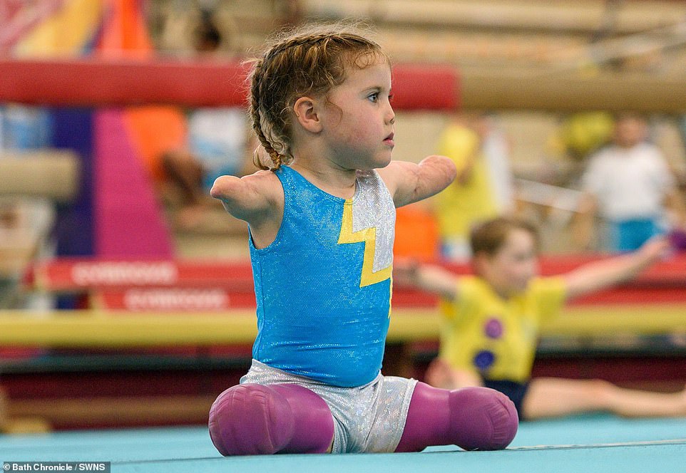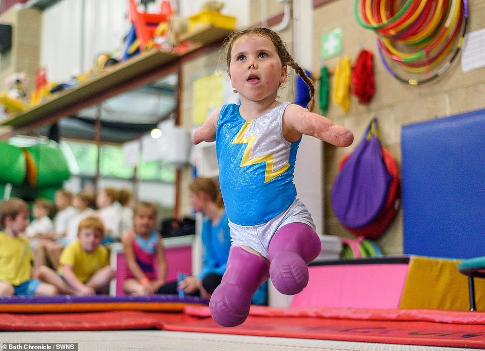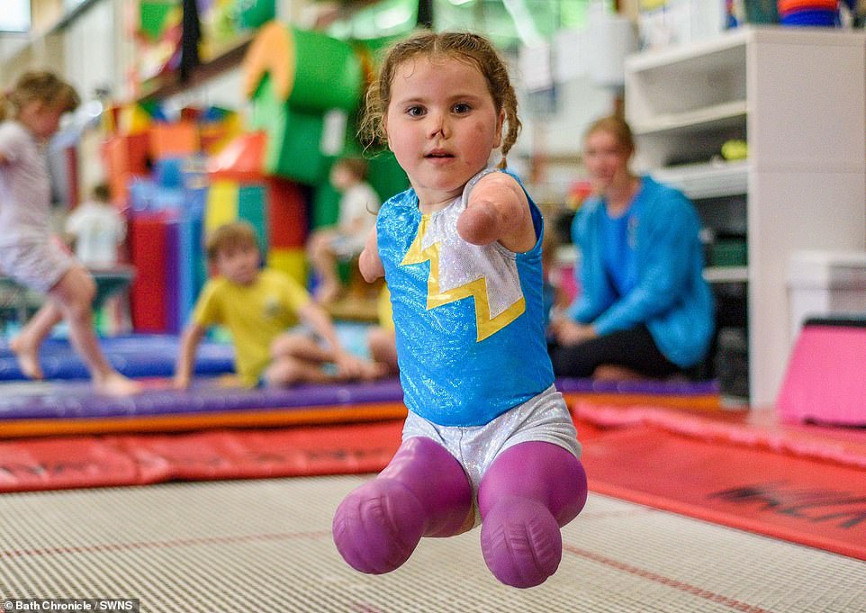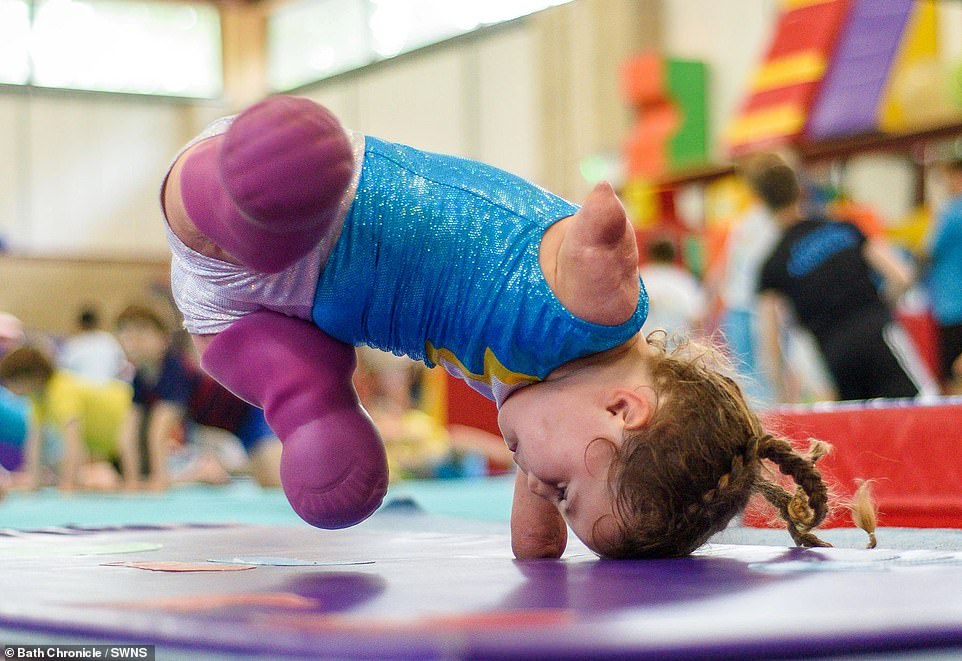Cô bé tham gia các lớp học thể dục hàng tuần tại Baskervilles Gymnastics ở Bath mà không dùng chân tay giả.