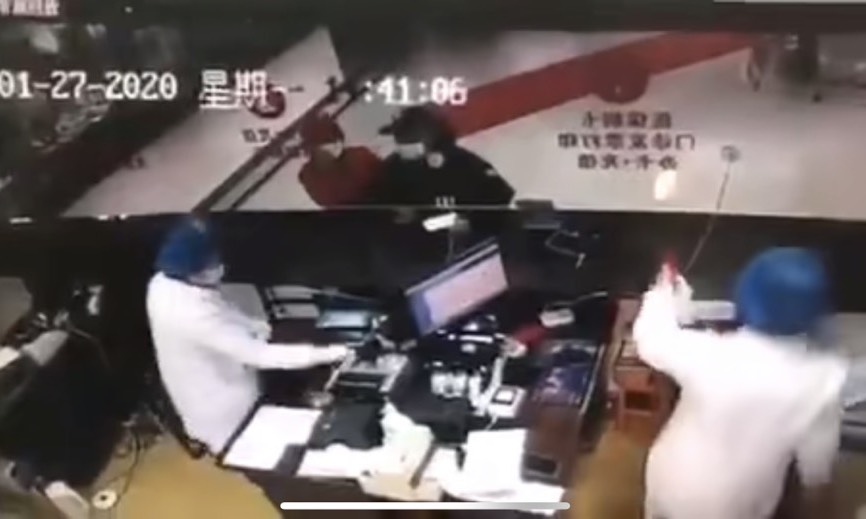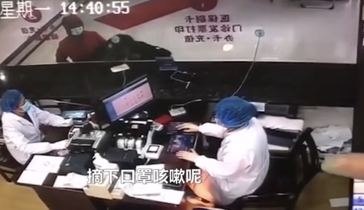 Theo như camera an ninh tại bệnh viện ghi lại, người đàn ông mặc áo đen tháo khẩu trang và ho vào khu có hai y tá đang ngồi rồi đeo lại và bỏ đi. Hai nhân viên lập tức bật dậy, sau đó dùng các biện pháp khử trùng, đồng thời tiến hành kiểm tra và báo cho các nhân viên an ninh khác.