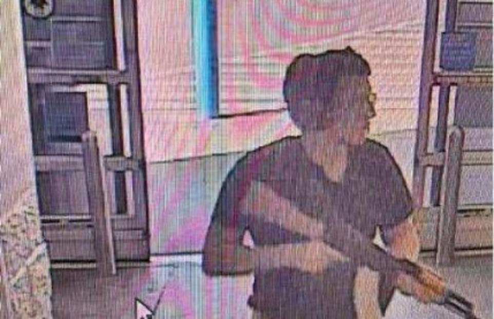 Tên sát nhân lăm le khẩu súng trường khi tiến vào siêu thị.