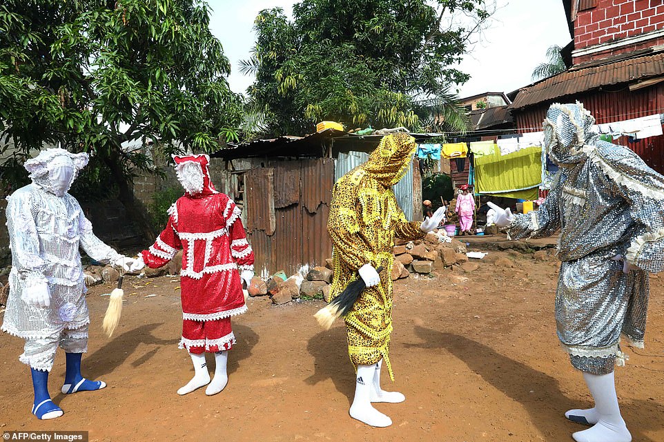 Các thành viên bộ lạc Kofi Jalloy miêu tả bốn con quỷ trong một buổi biểu diễn ở Freetown, thủ đô của Sierra Leone. (Những “con quỷ” được miêu tả từ trái sang phải là: Baykey, Faerie, Gargoda và Labalaba).