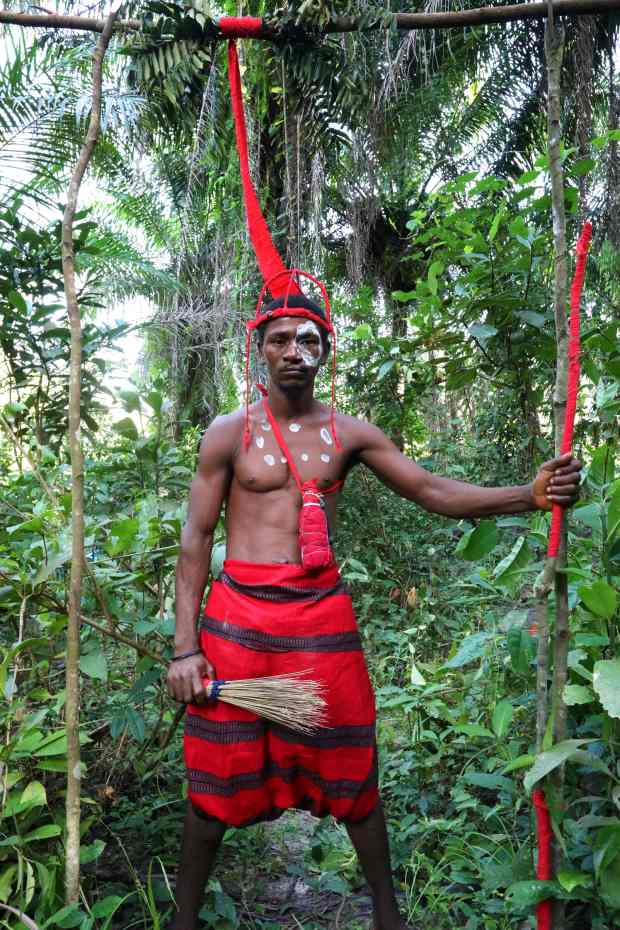 Yealie Kabba, một thành viên của “xã hội” Sampa Soko Bondo, đang đội một chiếc mũ đỏ có gương gọi là 'Kashak' và cầm một chai màu đỏ chứa đầy rượu thờ cúng.