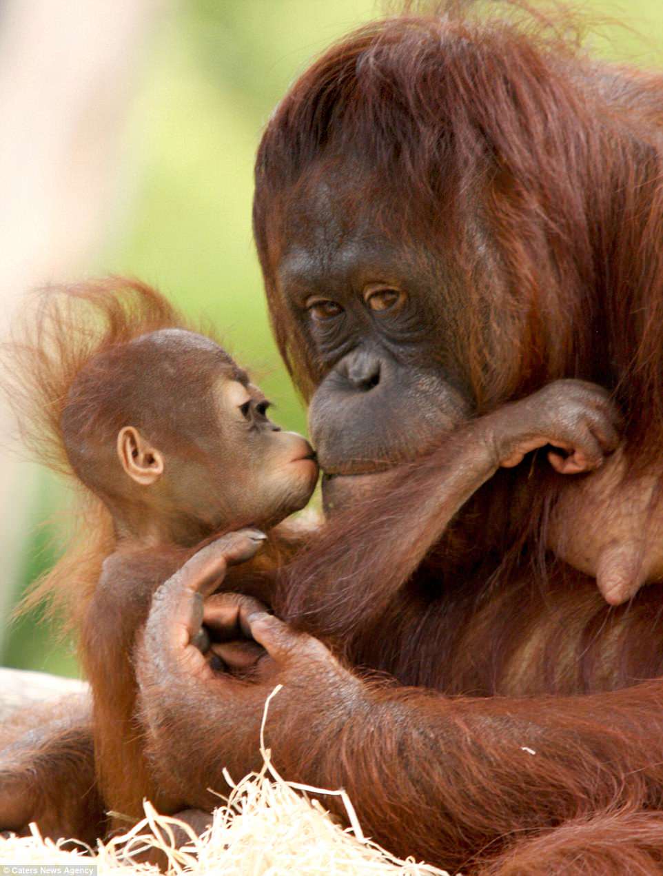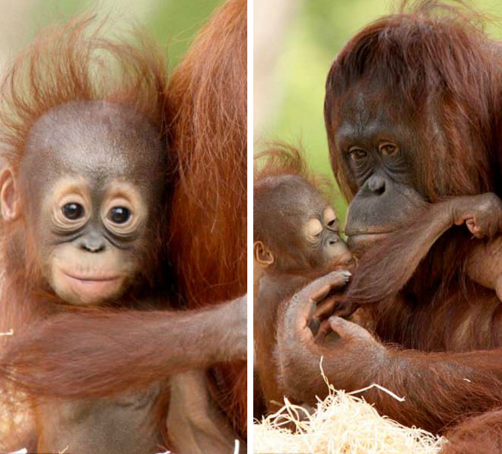 Indah chỉ 8 tháng tuổi nhưng trông rất tuyệt với mái đầu hói khi chơi đùa cùng mẹ Samboja. Khi đười ươi mẹ chỉ lên môi, dường như muốn một nụ hôn, “cô con gái nhỏ” liền hôn mẹ với niềm hạnh phúc hiện rõ trên gương mặt.