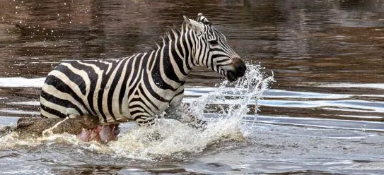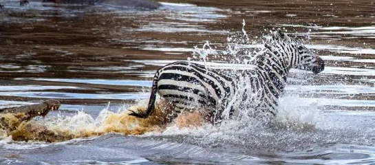 “Tất cả im lặng trong vài giây và sau đó là âm thanh lớn rồi đột nhiên cuộc chiến tử thần bắt đầu. Con ngựa vằn ngã xuống khi bị cá sấu ngoạm. Nó tìm cách chống trả, cố chạy dưới nước để thoát lên bờ. Dù trốn thoát, ngựa vằn đã bị cá sấu cắn mất một phần cơ thể”.