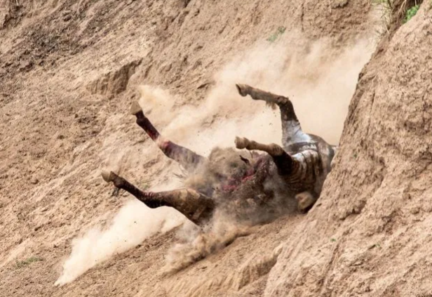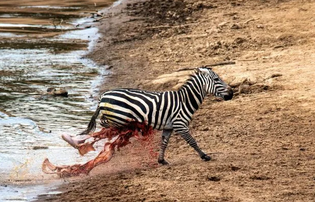 Con ngựa vằn bị thương nặng sau khi bị cá sấu cắn. Con vật vật lộn với vết thương khi lên tới bờ sông rồi gục chết.