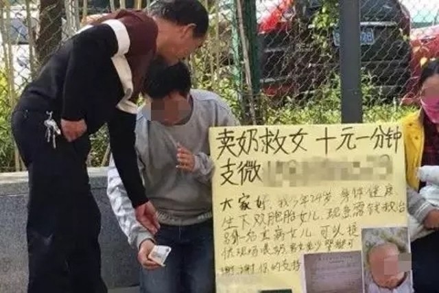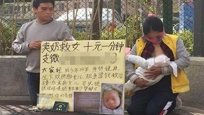 Câu chuyện đau lòng này xảy ra trên đường phố Thâm Quyến, Trung Quốc, hồi đầu tuần trước. Bức ảnh cho thấy người mẹ đang quỳ trên vỉa hè cho con bú, bên cạnh người chồng đang cầm tấm biển in dòng chữ: “Bán sữa mẹ, cứu con gái. 1 phút 10 nhân dân tệ (36 000 VND)”.