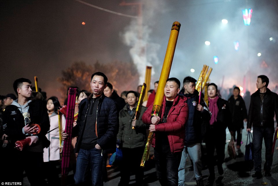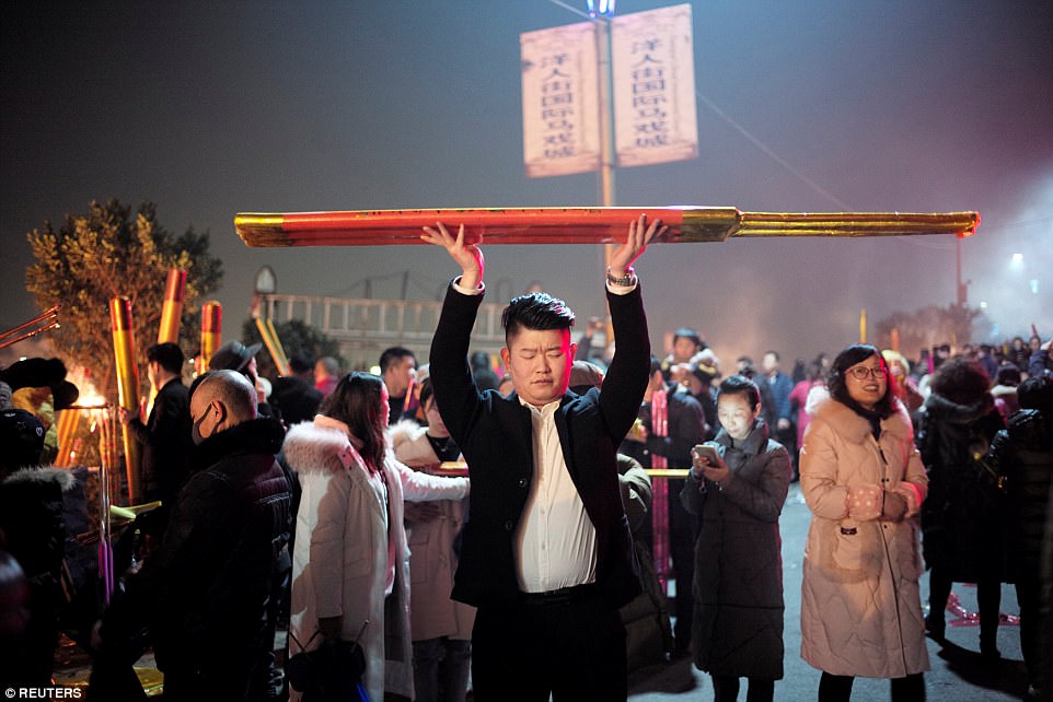 Một nhóm người vác những thanh hương khổng lồ đi lễ chùa ở Trùng Khánh, Trung Quốc.