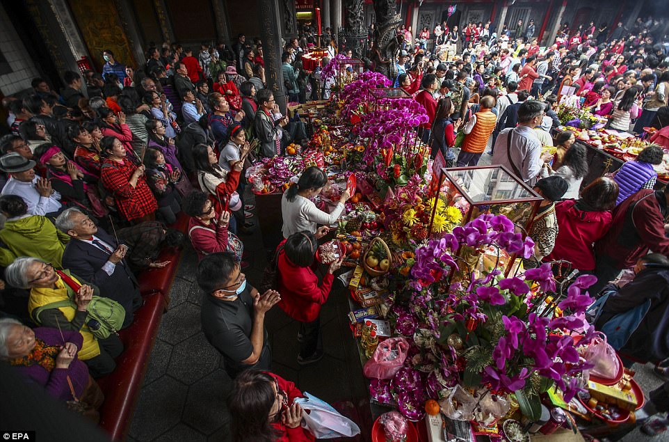 Cảnh người dân đi lễ chùa đầu năm ở một ngôi đền ở Đài Bắc, Đài Loan.